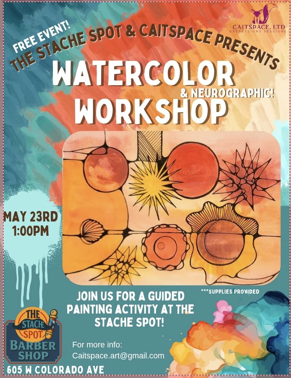 Stache Spot Barbershop Watercolor and Neurographic Workshop Saturday, May 23, 2026 1:00 PM 3:00 PM The Stache Spot Barbershop 605 West Colorado Avenue Colorado Springs, CO, 80905 United States (map) Google Calendar ICS